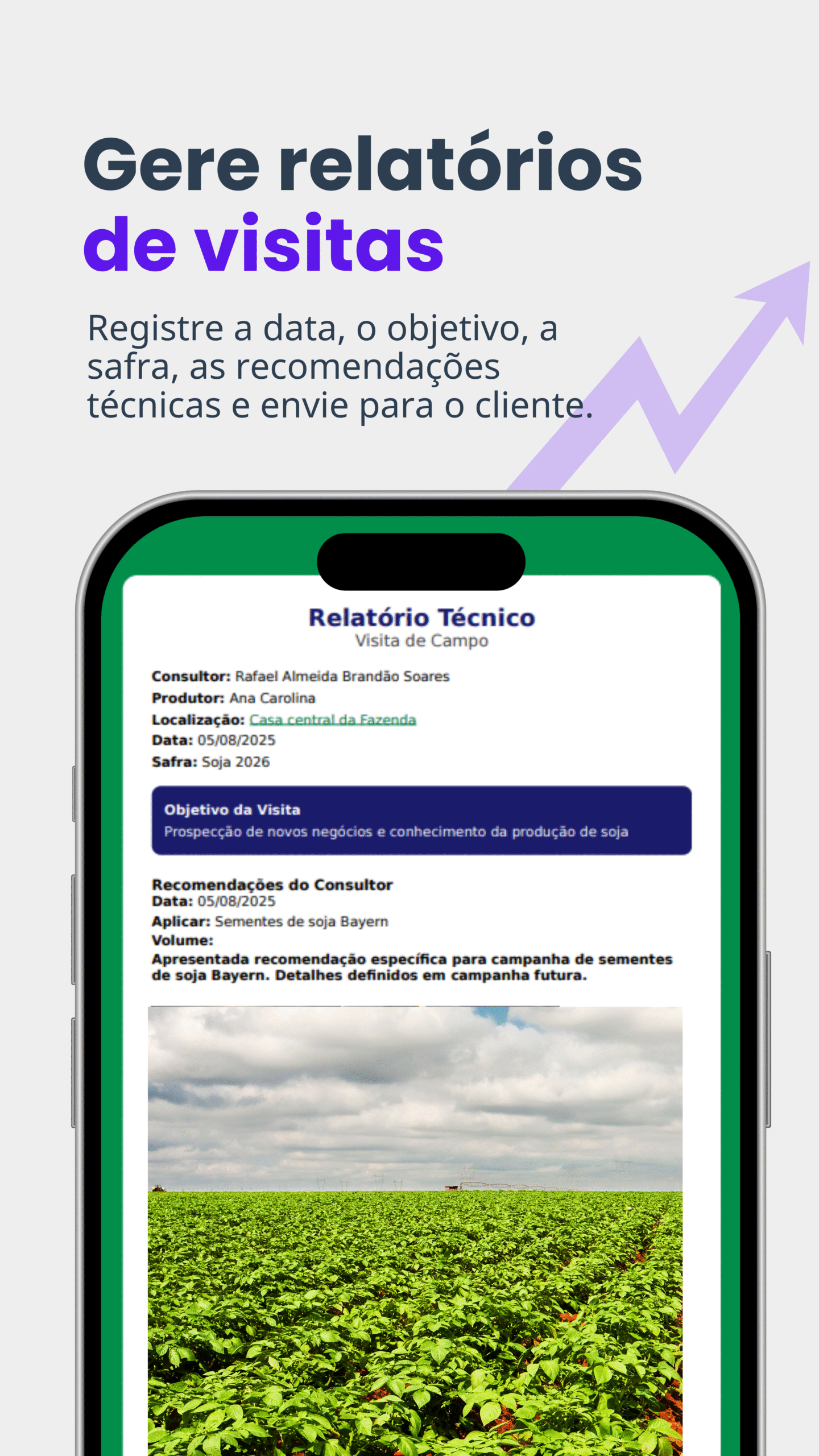 Conte com relatórios técnicos e de visita com informações sobre safra, objetivos, recomendações, imagens e muito mais. Garante a rastreabilidade de uma boa assistência técnica em campo.