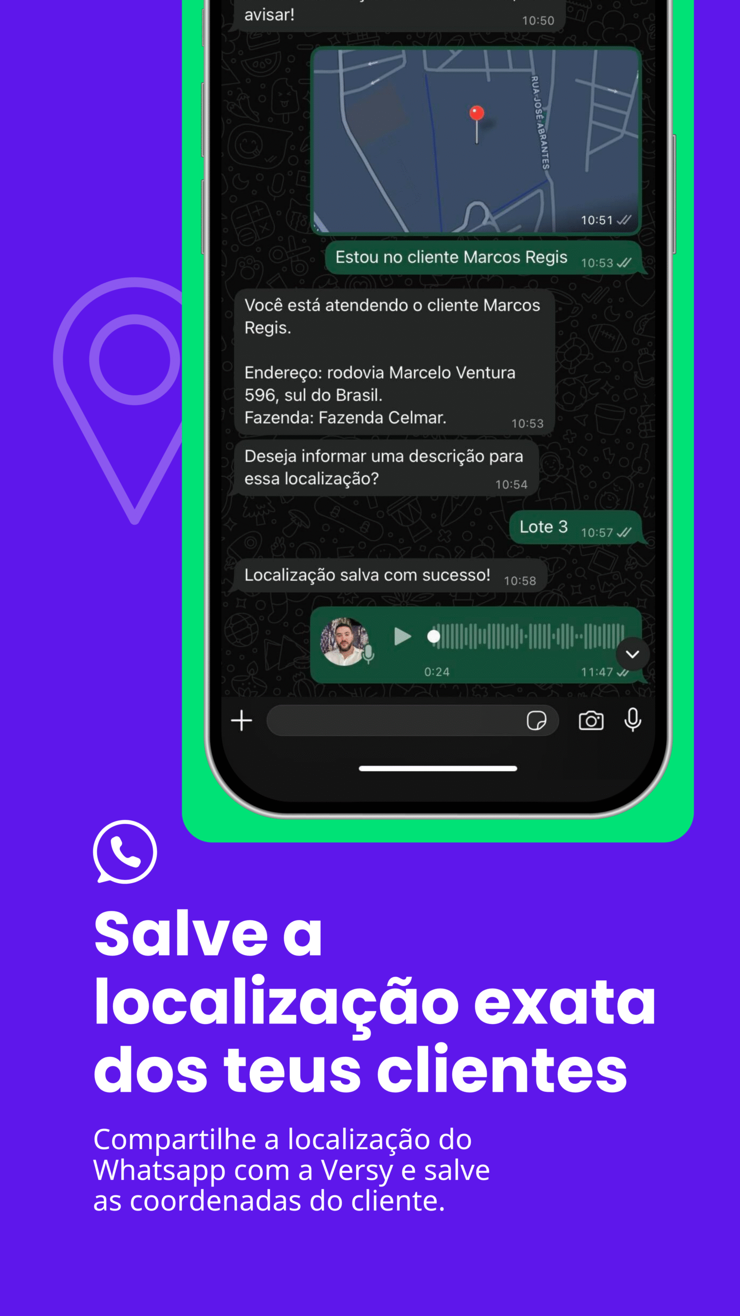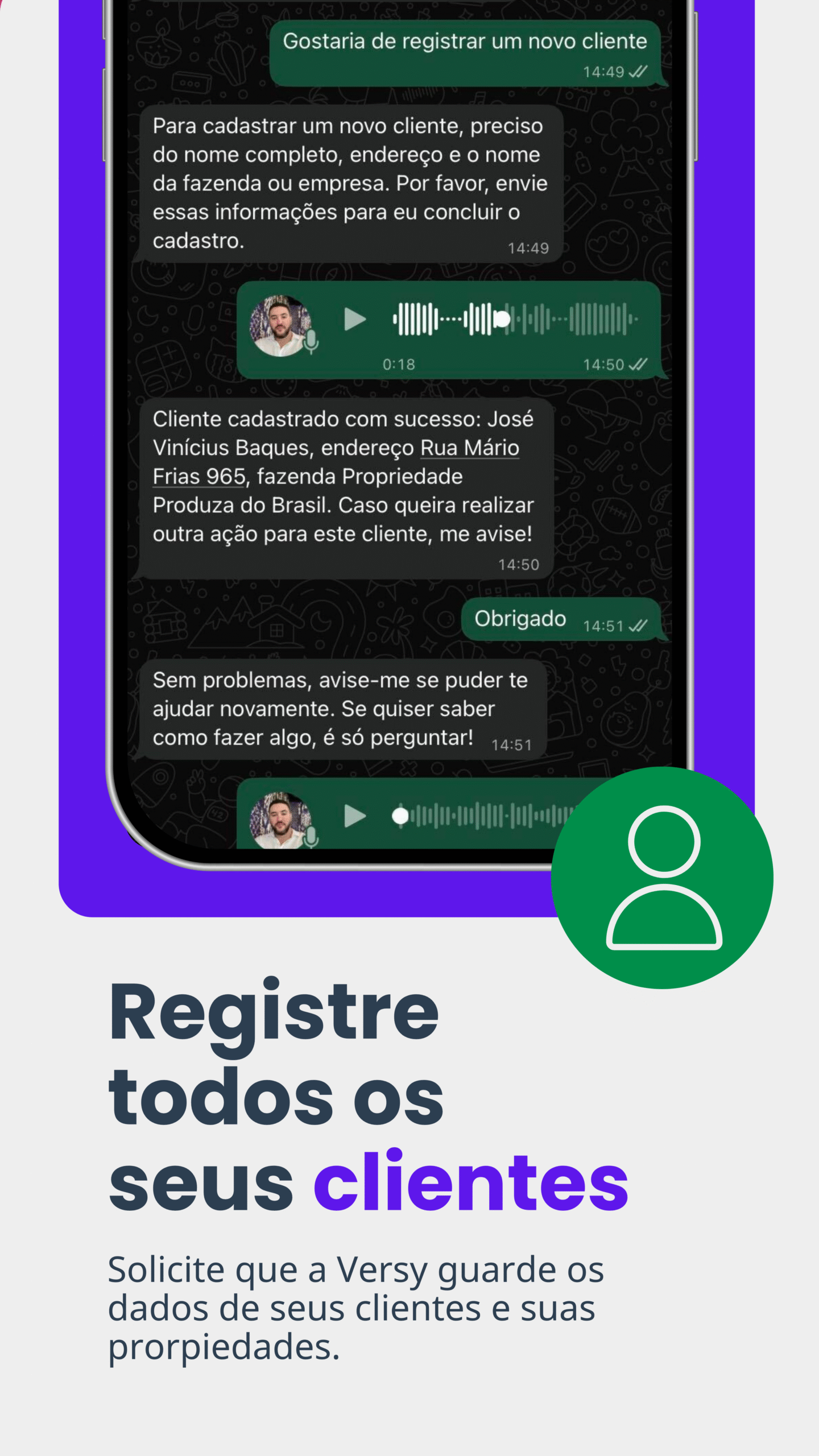 Registre clientes, propriedades e regiões simplesmente enviando áudios ou textos. Consulte informações sobre seus clientes e gere um resumo da sua relação com eles. A evolução dos CRMs está na palma da sua mão.