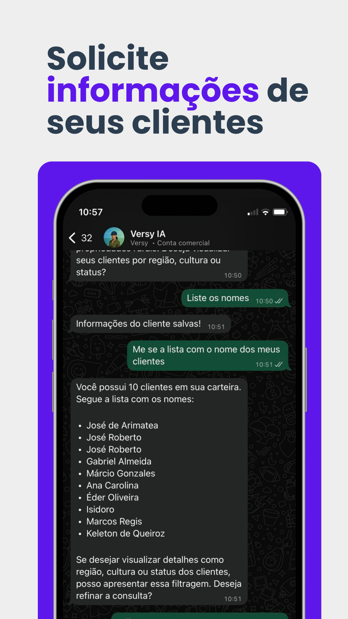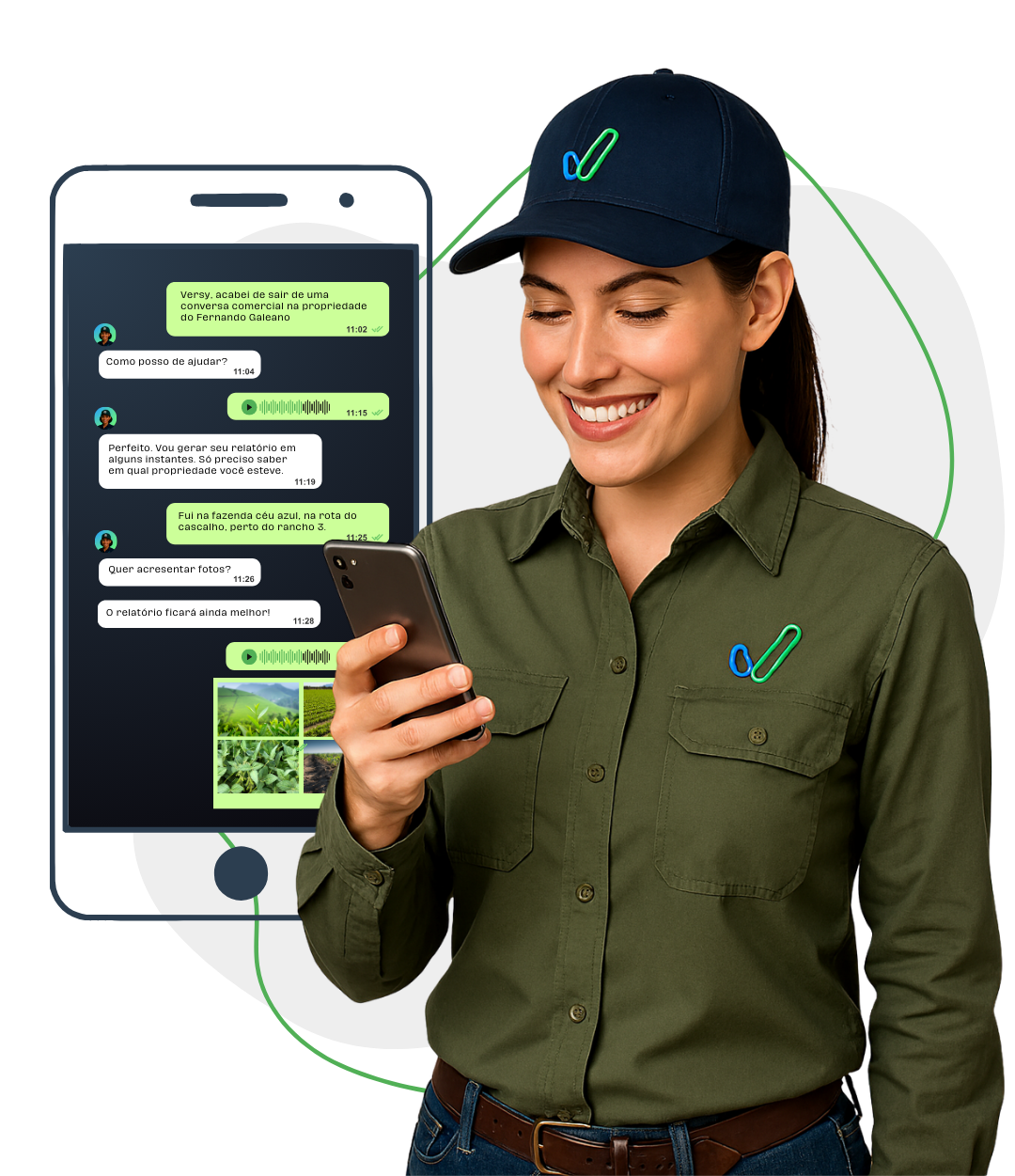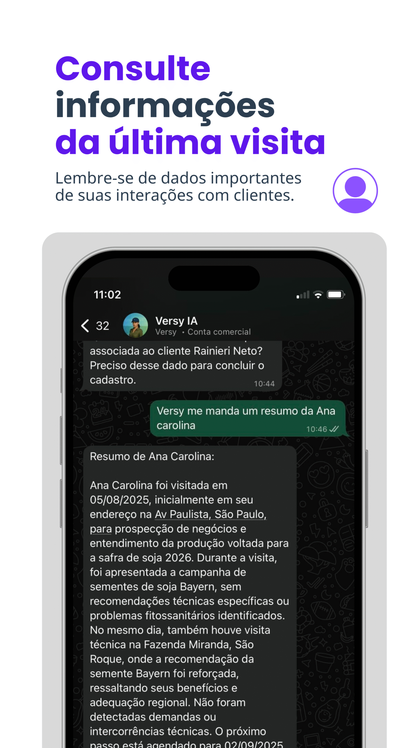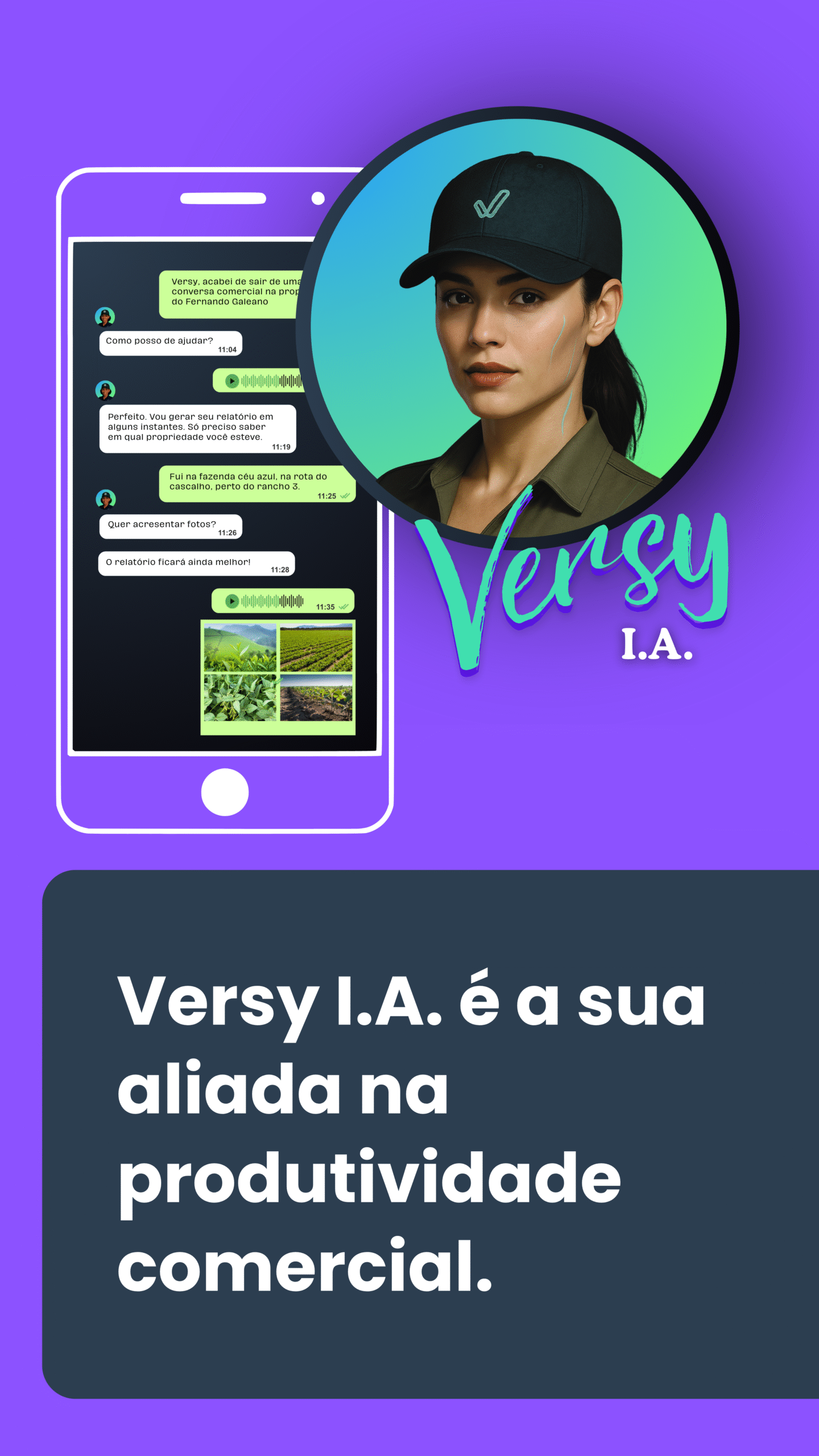 Versy é a Inteligência Artificial feita para as vendas no agro. Ela gera relatórios, registra e consulta informações dos seus clientes, analisa imagens e muito mais – tudo pelo WhatsApp.